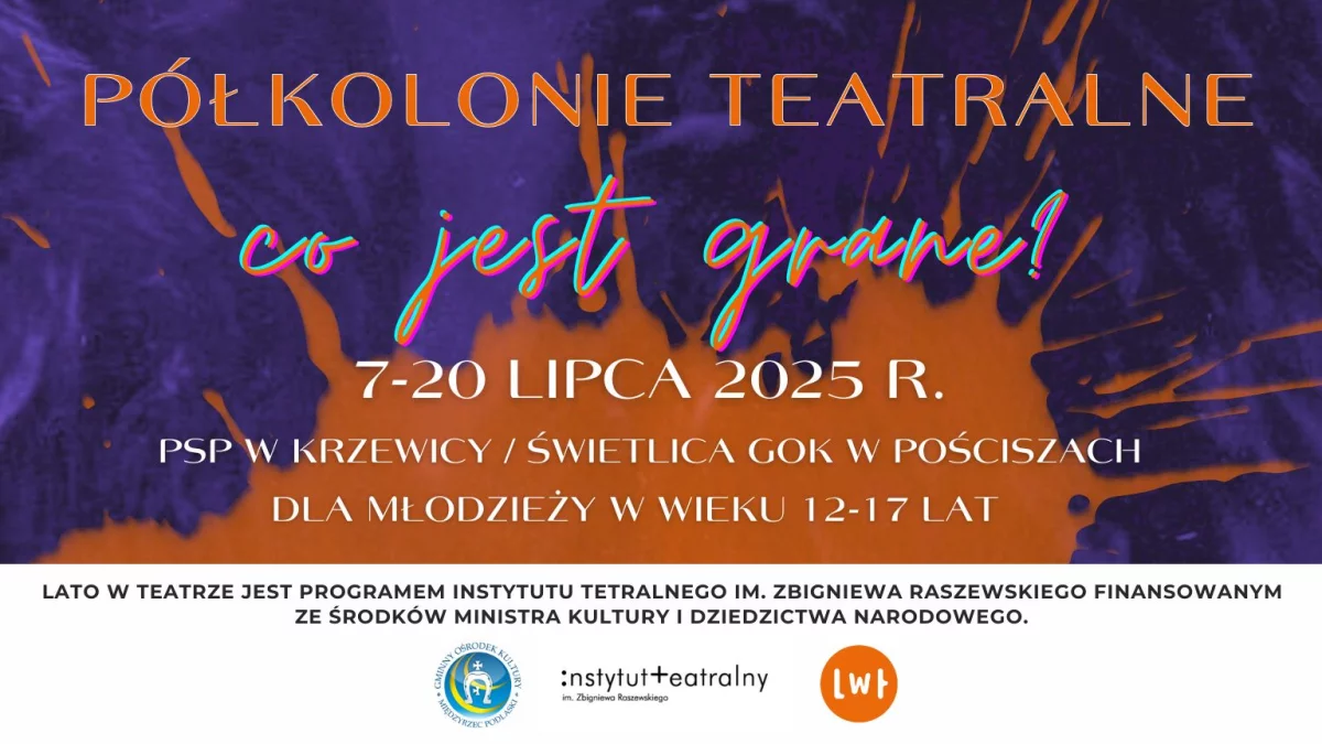 W dniach 7–20 lipca 2025 roku w Publicznej Szkole Podstawowej w Krzewicy oraz w świetlicy GOK w Pościszach odbędą się bezpłatne półkolonie teatralne dla młodzieży w wieku 12–17 lat. Projekt pod nazwą „Co jest grane?” organizowany jest w ramach ogólnopolskiego programu „Lato w teatrze”, finansowanego ze środków Ministerstwa Kultury i Dziedzictwa Narodowego.