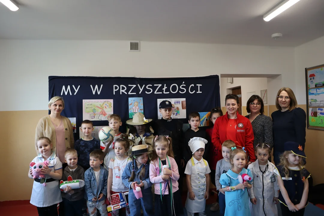 Powstały też piękne prace na temat ,,My w przyszłości”. Dzieci miały też okazję obejrzeć stoiska z akcesoriami i narzędziami potrzebnymi do pracy osobom wykonującym różne zawody. Na zakończenie zajęć odwiedził ich gość specjalny - pani Agnieszka, która opowiedziała o pracy ratownika wodnego.