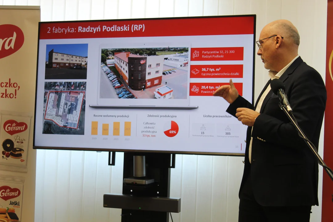 - Dr Gerard jest jednym z największych producentów ciastek w regionie. Mówimy tutaj o regionie Europy środkowo-wschodniej. Firma obchodziła w tym roku swoje 30-lecie. W portfelu produktowym znajduje się ponad 200 produktów, które w czasie rozwoju firmy wprowadzaliśmy na rynek i z powodzeniem sprzedajemy je w wielu krajach. Firma ma dwa zakłady produkcyjne - w Międzyrzecu Podlaskim i Radzyniu. Posiada centrum dystrybucyjne w Bedlnie oraz ma biura handlowe w Warszawie, Bukareszcie i Budapeszcie - mówi prezes Jarosław Zawadzki, przedstawiając jednocześnie zakład w Międzyrzecu i mówiąc o tym, że przez najbliższe 24 miesiące firma chce wydać na inwestycje więcej niż przez ostatnie 10 lat.