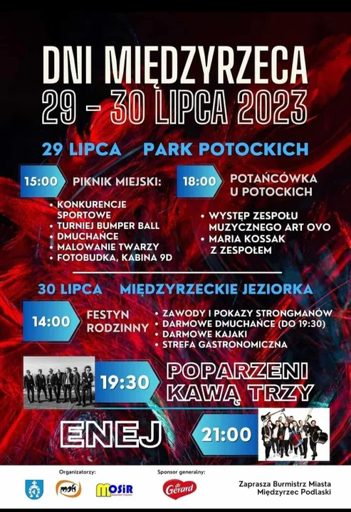 Niedziela, to jak zwykle podczas Dni Międzyrzeca, blok koncertowy. Na scenie jako gwiazda wieczoru pojawi się Enej, a tuż przed nimi wystąpią muzycy z zespołu Poparzeni Kawą Trzy. Od 14:00 na międzyrzeckich jeziorkach będzie można wziąć udział w rodzinnym festynie, podczas którego mieszkańcy miasta skorzystają z bezpłatnych kajaków czy darmowych dmuchańców. Te będą dostępne do rozpoczęcia części koncertowej, a więc 19:30.