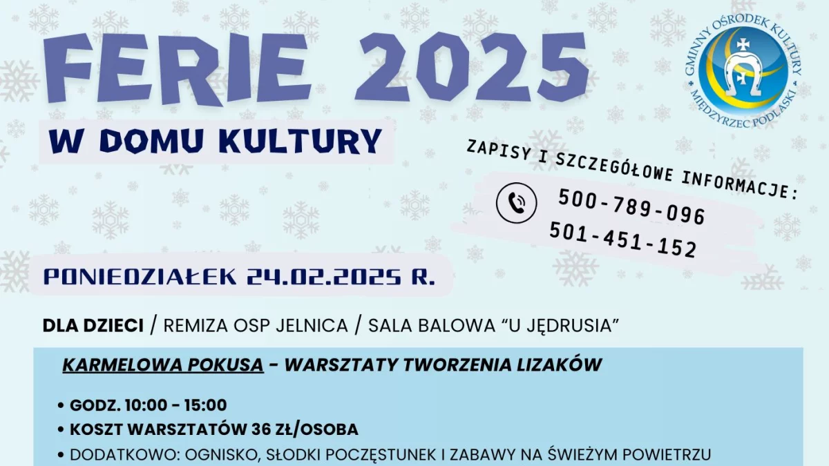 Pierwszego dnia ferii, 24 lutego, dla najmłodszych przygotowano warsztaty „Karmelowa Pokusa” w remizie OSP Jelnica i sali balowej „U Jędrusia”. Podczas zajęć dzieci nauczą się tworzenia lizaków, a dodatkowo czeka na nie ognisko, słodki poczęstunek i zabawy na świeżym powietrzu. Koszt udziału wynosi 36 zł za osobę. Dla młodzieży w wieku 13-19 lat w siedzibie GOK w Wysokim odbędą się warsztaty z Kamilem Tarkowskim. Uczestnicy będą mogli spróbować swoich sił w tworzeniu graffiti na płytach winylowych oraz w kolażu artystycznym. Koszt udziału w dwóch warsztatach to 140 zł.