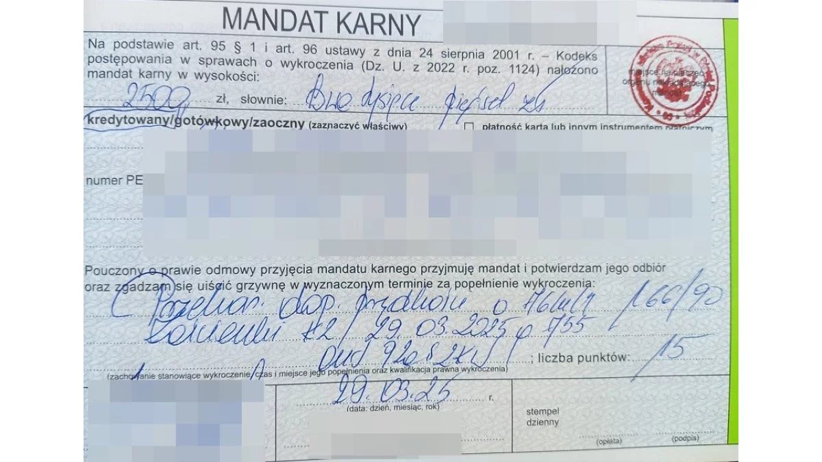 Za popełnione wykroczenie otrzymała mandat karny w wysokości 2,5 tysiąca złotych. Jej konto „wzbogaciło się” także o 15 punktów karnych.