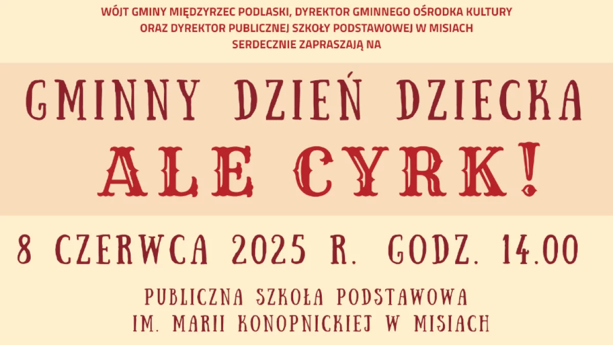 Informacje międzyrzeckieWójt Gminy Międzyrzec Podlaski, Dyrektor Gminnego Ośrodka Kultury oraz Dyrektor Publicznej Szkoły Podstawowej im. Marii Konopnickiej w Misiach zapraszają wszystkie dzieci z rodzicami na Gminny Dzień Dziecka – „ALE CYRK!”.