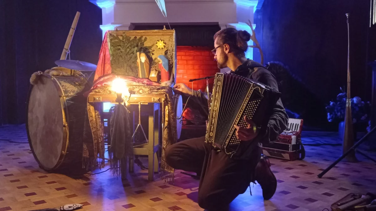 Spektakl zaprezentował Teatr Latarnia z Borków w gminie Supraśl. Całość miała kameralny, a zarazem niezwykle sugestywny charakter. Z niewielkiej walizki po starym akordeonie „ożyły” ręcznie wykonane lalki, tradycyjne kolędy i opowieści znane z ludowej kultury regionu. Szczególną uwagę widzów przyciągnęła muzyka grana na żywo – zabrzmiał przedwojenny akordeon, bębenek obręczowy, kuty trójkąt, różnorodne perkusjonalia, a nawet lira, tworząc autentyczną atmosferę podlaskiego kolędowania.