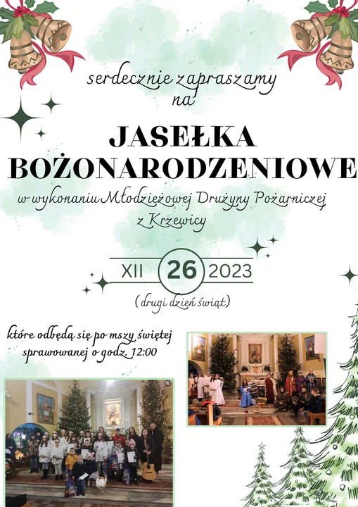Informacje międzyrzeckieDrugiego dnia świąt, tuż po mszy świętej w kościele w Krzewicy planowane są jasełka przygotowane przez Młodzieżową Drużynę Pożarniczą z Krzewicy.