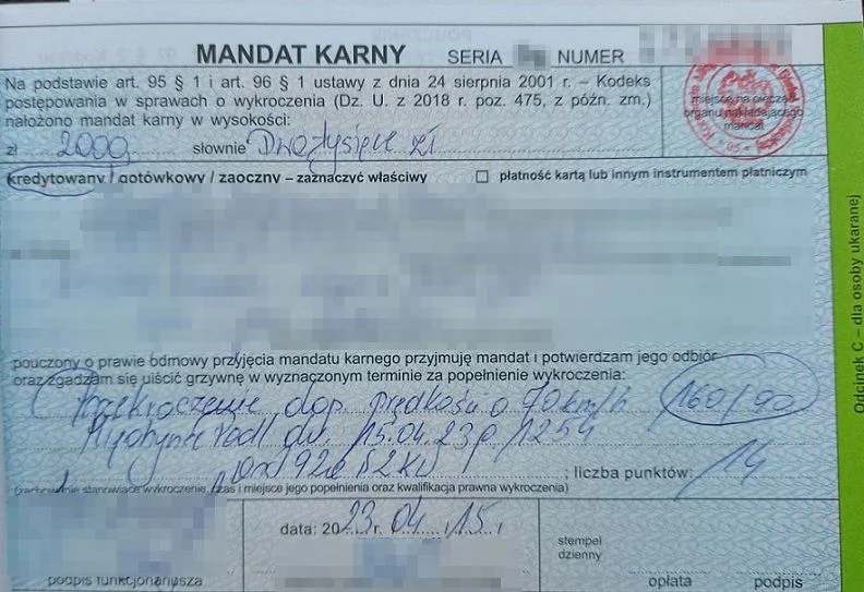 Dostał mandat karny w kwocie 2 tysięcy złotych i 14 punktów karnych.