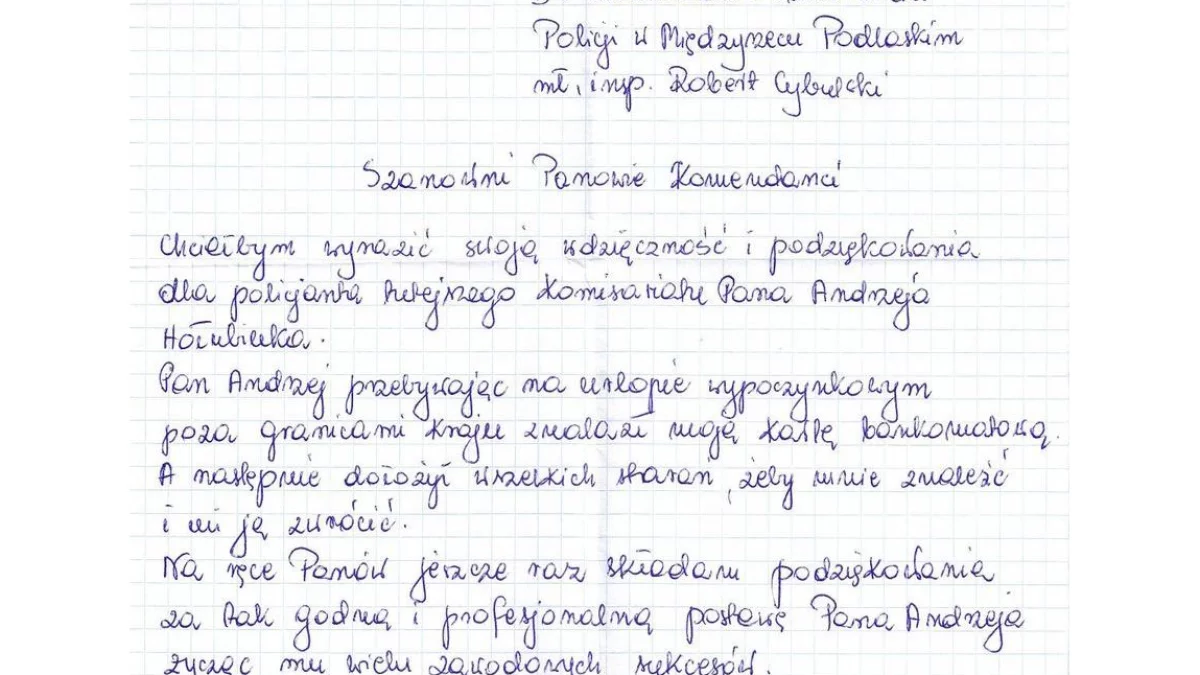 - Funkcjonariusz dołożył wszelkich starań, żeby odnaleźć właściciela i zwrócić zgubę. Okazało się, że jest to kierowca ciężarówki, który jeszcze nie zdążył odjechać z tego miejsca. Dzięki szybkiej reakcji policjanta karta wróciła do właściciela. W związku z tym zdarzeniem na ręce Komendanta Miejskiego Policji w Białej Podlaskiej insp. Andrzeja Antoniewskiego oraz Komendanta Komisariatu w Międzyrzecu Podlaskim mł. insp. Roberta Cybulskiego wpłynęły podziękowania od zadowolonego mieszkańca Jeleniej Góry - właściciela karty - opisuje nadkomisarz Barbara Salczyńska-Pyrchla z KMP w Białej Podlaskiej.