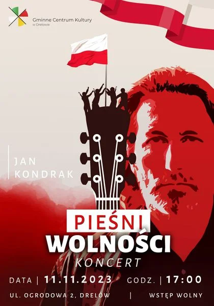 Informacje międzyrzeckieGmina Drelów Święto Niepodległości będzie świętowała z Janem Kondrakiem. 11 listopada o godzinie 17:00 w Gminnym Centrum Kultury odbędzie się koncert. Więcej informacji na plakacie.