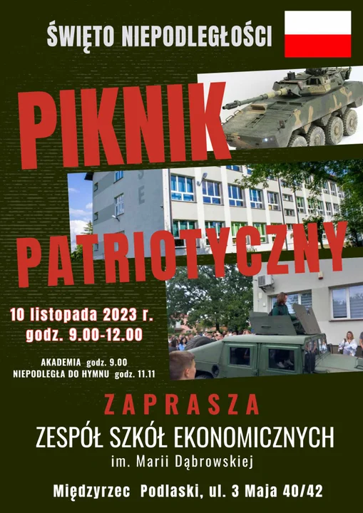 Informacje międzyrzeckieW najbliższy piątek, 10 listopada w Zespole Szkół Ekonomicznych odbędzie się Piknik patriotyczny. Start wydarzenia planowany jest na godzinę 9:00 na dziedzińcu szkoły. W programie przewidziano wiele atrakcji, do których będzie należało m.in. spotkanie z przedstawicielami Wojska Polskiego, pokaz sprzętu wojskowego oraz degustacja wojskowej grochówki i bigosu. Na piknik zapraszani są przede wszystkim uczniowie międzyrzeckich szkół oraz sami mieszkańcy. Więcej informacji na plakacie.