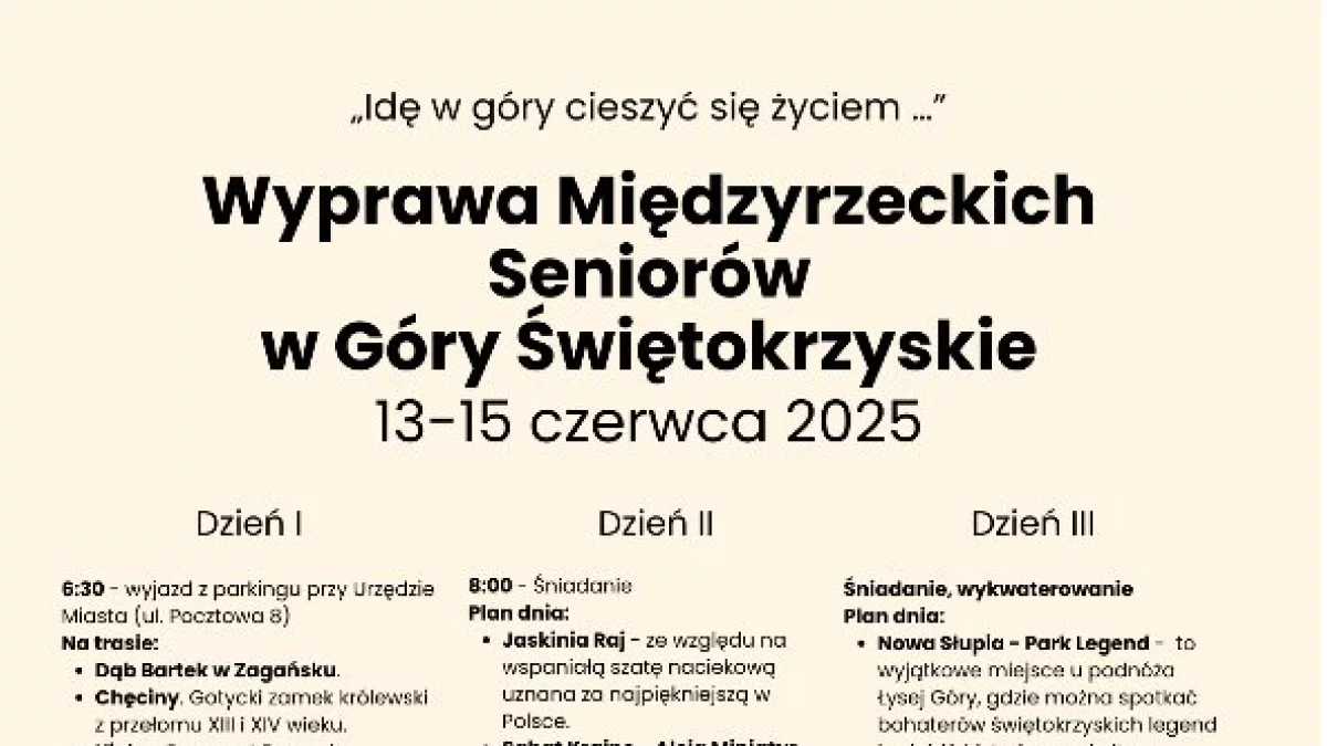 W programie przewidziano zwiedzanie najciekawszych miejsc regionu, m.in. Dąb Bartek, ruiny zamku królewskiego w Chęcinach, Rezerwat Przyrody Kadzielnia w Kielcach, Jaskinię Raj, Aleję Miniatur w Krajnie oraz Święty Krzyż z Muzeum Przyrodniczym Świętokrzyskiego Parku Narodowego. Każdego dnia uczestnicy będą mieli zapewnione atrakcje turystyczne oraz wieczorne spotkania integracyjne z grillem i ogniskiem.