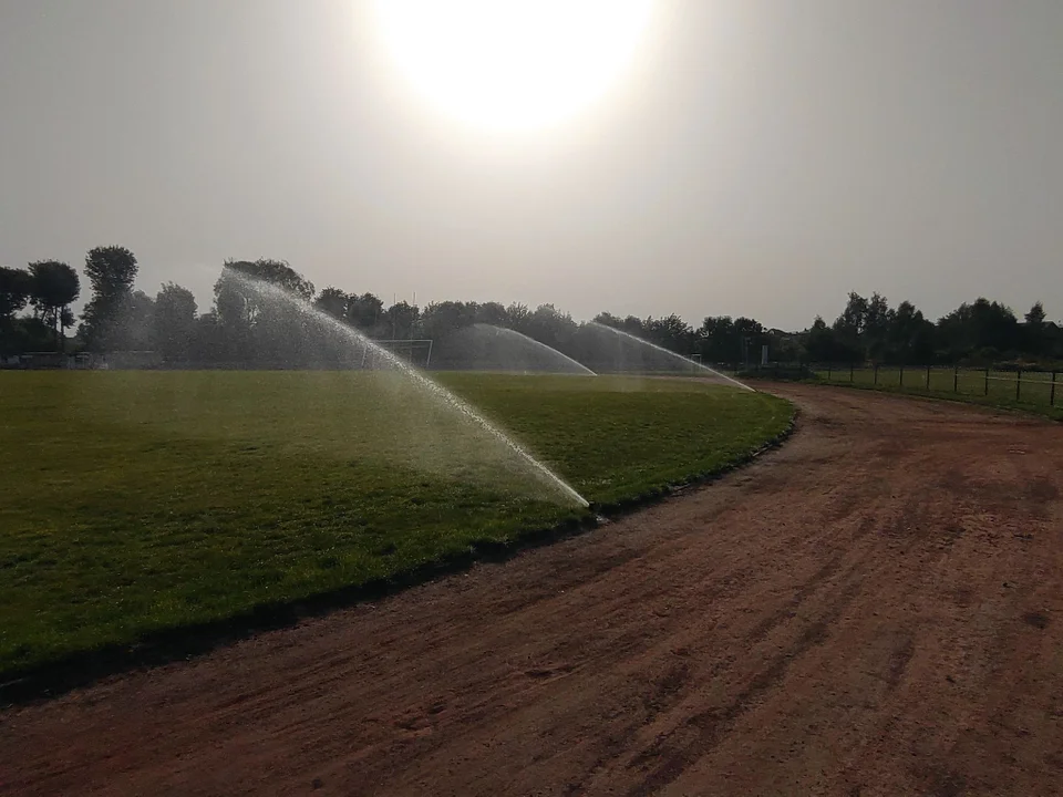 Po przeprowadzeniu postępowania został wyłoniony wykonawca, który na początku sierpnia przystąpił do prac ziemnych. Zostało ułożone orurowanie i okablowanie, studnie rewizyjne i zainstalowane zraszacze. Łącznie na płycie boiska oraz na zakolach, które również są wykorzystywane podczas treningów piłkarskich, zostały zainstalowane 32 zraszacze zgrupowane w 8 sekcjach. Zraszacze uruchamiane są automatycznie po cztery sztuki, wykonując ruch 360 lub 180 stopni. W ten sposób nawadniana jest cała płyta, łączny czas nawadniania do uzyskania 5 mm pokrycia opadem wody trwa około 3 godzin.