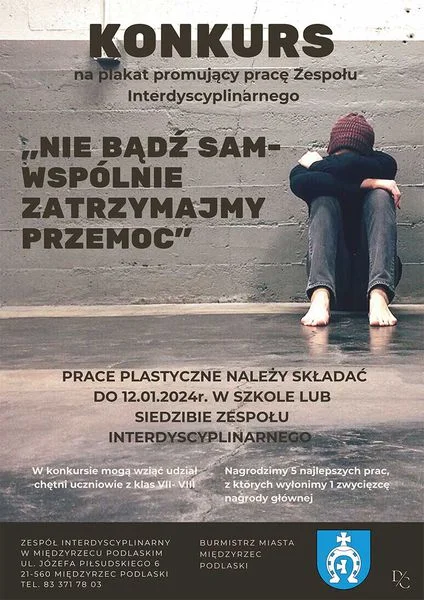 Informacje międzyrzeckieBurmistrz miasta Międzyrzec Podlaski zaprasza do udziału w konkursie "Nie bądź sam - wspólnie zatrzymajmy przemoc". Należy stworzyć plakat, a więcej informacji znajduje się na plakacie.