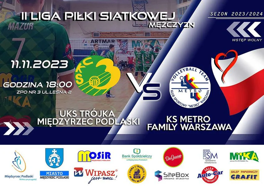 Informacje międzyrzeckieTrójka Międzyrzec Podlaski po raz kolejny zechce udowodnić, że we własnej hali potrafi zatrzymać każdego. 11 listopada podopieczni Pawła Bielińskiego zmierzą się o godzinie 18:00 ze stołecznym Metrem. Więcej informacji na plakacie.