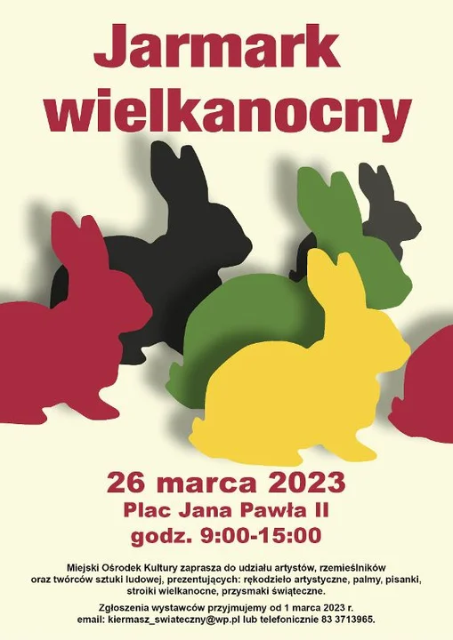 Jarmark odbędzie się już 26 marca na Placu Jana Pawła II w Międzyrzecu Podlaskim i potrwa od godziny 9:00 do 15:00. Międzyrzecki MOK zaprasza artystów, rzemieślników oraz twórców sztuki ludowej, którzy zaprezentują rękodzieło artystyczne, pisanki, palmy, stroiki wielkanocne oraz przysmaki świąteczne. Zgłoszenia przyjmowane są mailowo: kiermasz_swiateczny@wp.pl lub pod numerem telefonu: 83 371 39 65.