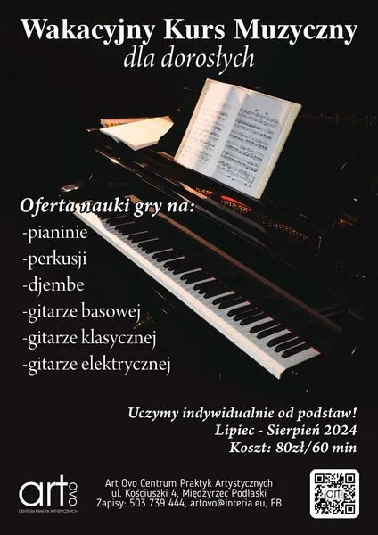 Informacje międzyrzeckieART OVO zaprasza na zajęcie muzyczne dla dorosłych. W swojej wakacyjnej ofercie oferują naukę gry na pianinie, perkusji, djembe czy na gitarach. Więcej informacji na plakacie.