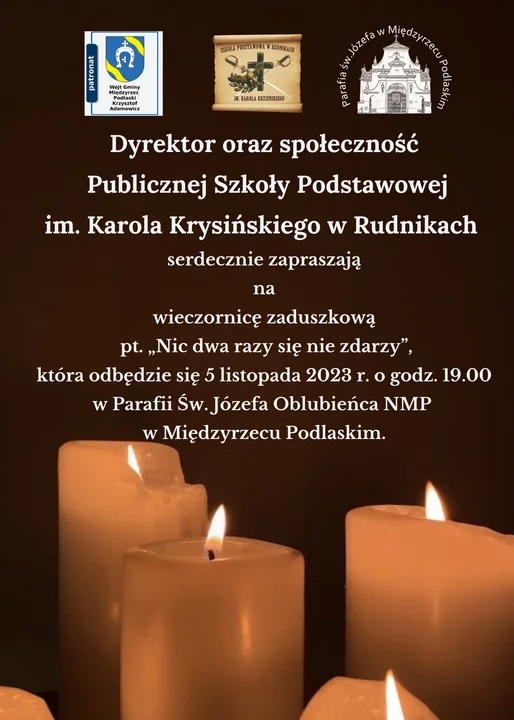 Informacje międzyrzeckie5 listopada o godzinie 19:00 w kościele pw. św. Józefa Oblubieńca NMP w Międzyrzecu Podlaskim odbędzie się wieczornica zaduszkowa, na którą zaprasza dyrektor oraz społeczność Publicznej Szkoły Podstawowej w Rudnikach.
