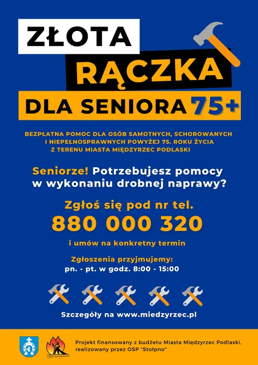 Informacje międzyrzeckieRuszył miejski program Złota Rączka dla Seniora 75+. To bezpłatna pomoc w drobnych naprawach dla osób samotnych, schorowanych i niepełnosprawnych z terenu miasta Międzyrzec Podlaski. Projekt finansowany jest z budżetu miasta, a seniorzy już teraz mogą zgłaszać swoje potrzeby. Więcej informacji na plakacie.