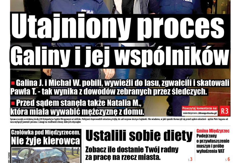 Sprawa ruszyła w minioną środę (28 listopada) w Sądzie Okręgowym w Lublinie. Policjanci doprowadzili oskarżoną trójkę do sali rozpraw skutą w kajdanki. Domniemani sprawcy szli w milczeniu, unikając spojrzeń fotoreporterów. Natalia M. narzuciła kaptur kurtki na głowę, by nie pokazywać swojej twarzy. Nie wiadomo, w jaki sposób tłumaczyli się przed sądem oskarżeni - sędzia Piotr Łaguna od razu wyłączył jawność procesu z uwagi na możliwość obrazy dobrych obyczajów.