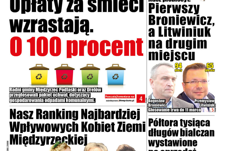 Podczas ostatniej sesji Rady Gminy Międzyrzec Podlaski 27 lutego radni przyjęli pakiet uchwał, dotyczący gospodarowania odpadami komunalnymi. Najważniejsze dla mieszkańców zmiany dotyczą opłat. Stawka dla mieszkańców gminy Międzyrzec Podlaski wynosić będzie 14 zł miesięcznie od jednego mieszkańca. Trzy razy więcej - 42 zł za miesiąc - zapłacą osoby, które nie będą zbierać odpadów w sposób selektywny. Przypomnijmy, że dotychczas obowiązującą stawką jest 7 zł od osoby za miesiąc w przypadku odpadów zbieranych selektywnie i 18 zł w przypadku odpadów nieselekcjonowanych.