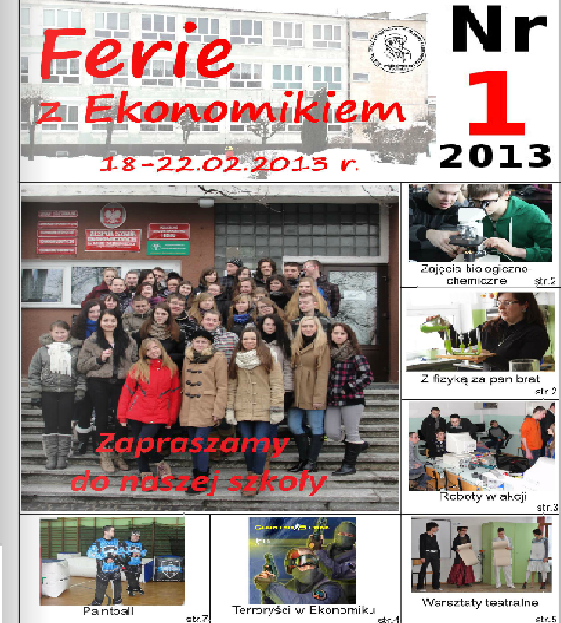 Praca ta zaowocowała wydaniem gazetki "Ferie z Ekonomikiem". Młodzież w bardzo ciekawy sposób przedstawiła to co się działo w ZSE w drugim tygodniu ferii. Numer pierwszy swojej gazetki wydali nie tylko w formie papierowej, ale także elektronicznej: LINK.