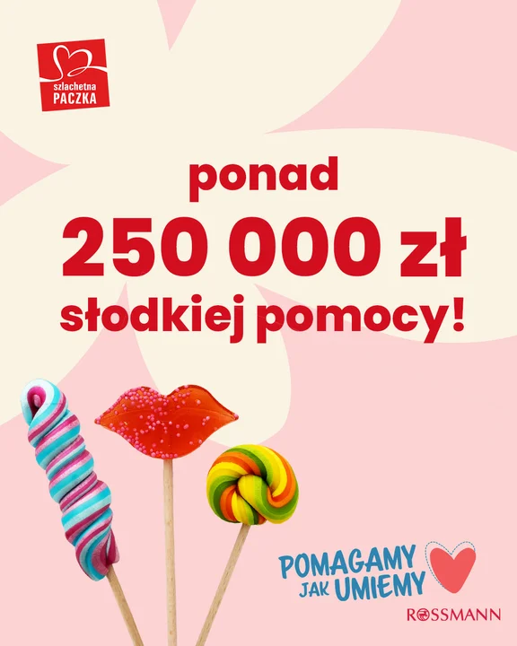 PROMOWANE125 000 sprzedanych lizaków – to efekt wspólnej akcji Szlachetnej Paczki i Rossmanna. Każdy, kto od 1 do 14 lutego kupił specjalny lizak, wsparł najbardziej potrzebujące rodziny i osoby samotne, którymi opiekuje się Szlachetna Paczka. Przekazaliśmy im 250 tys. zł.