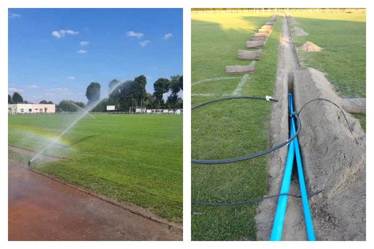 Powodem są prace nad kolejnym projektem na stadionie miejskim. Tym razem firma zajmuje się instalacją nawodnienia głównej płyty boiska. Odbyła się próba generalna. Poszło świetnie. Teraz czas, by ubytki nawierzchni ukorzeniły się i obiekt w Międzyrzecu Podlaskim będzie mógł pochwalić się automatycznymi "prysznicami" dla murawy.