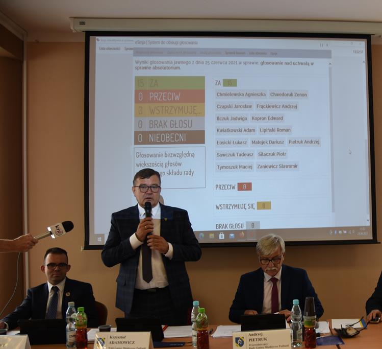 25 czerwca radni jednogłośnie głosowali za przyjęciem uchwały w sprawie rozpatrzenia i zatwierdzenia sprawozdania finansowego wraz ze sprawozdaniem wójta gminy z wykonania budżetu za 2020 rok. Wójt Gminy otrzymał absolutorium, 15 radnych głosowało za udzieleniem absolutorium. W roku 2020 przeprowadzono 48 inwestycji na łączną kwotę ponad 9 mln zł. Udzielono również trzech dotacji powiatowi bialskiemu w wysokości ponad 47 tys zł. Budżet gminy Międzyrzec Podlaski za rok 2020 zamknięto nadwyżką w wysokości ok. 4,5 mln zł. Zaplanowane na kwotę 67.2 mln zł dochody zrealizowano w 101% kwotą 67,6 mln zł zł, z czego dochody bieżące zrealizowano w 97%, natomiast majątkowe w 123%. Wydatki zaplanowane w wysokości 67 mln zł zł wykonano w 94% kwotą 63 mln zł zł, z czego wydatki bieżące zrealizowano w 95%, a majątkowe w 88%. Uznano, że sytuacja finansowa Gminy Międzyrzec Podlaski jest dobra a zrealizowane wydatki wykorzystano "oszczędnie i racjonalnie".